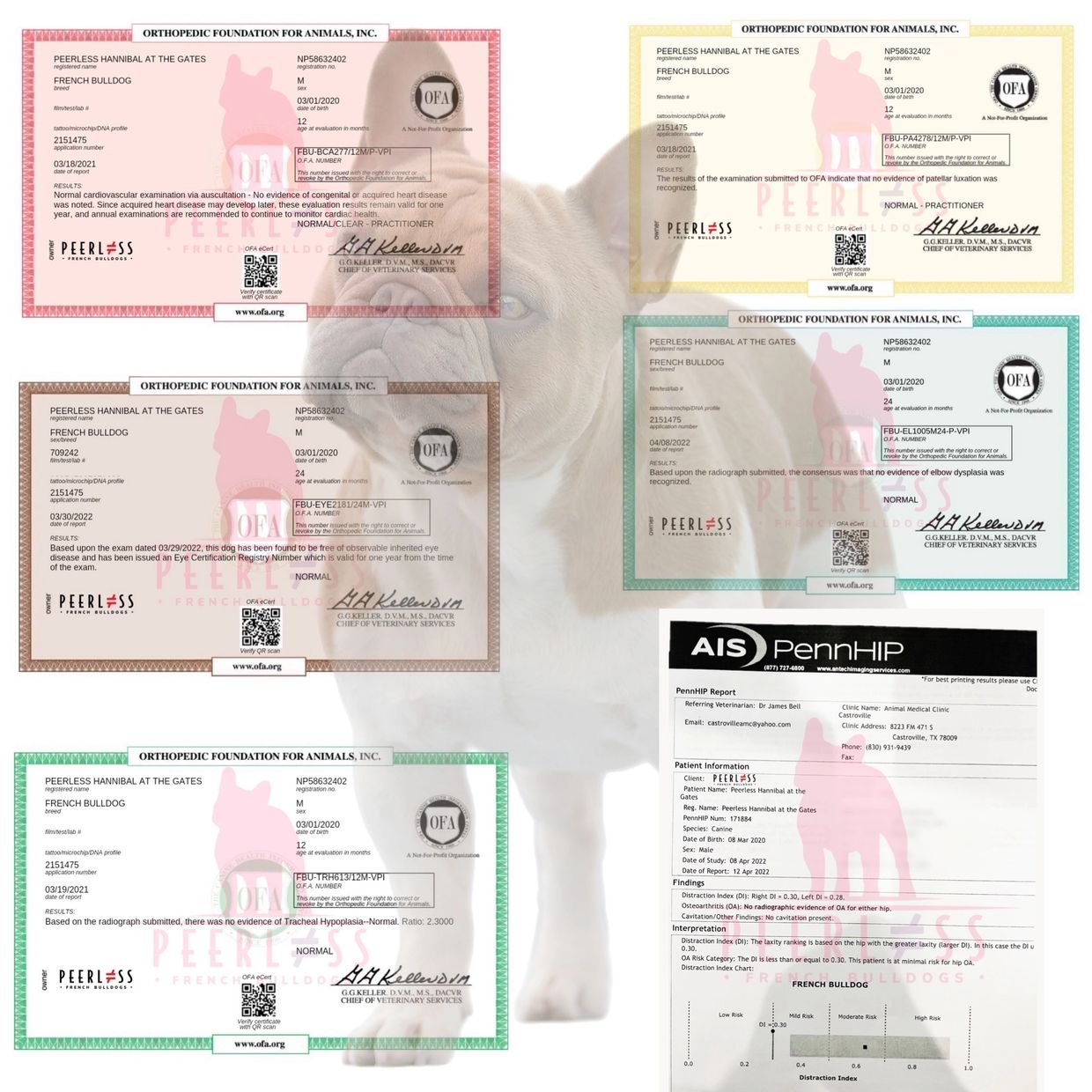 After having completed every health test recommended for French Bulldogs by the OFA and French Bulldog Club of America, Grand Champion Hannibal now qualifies for the Canine Health Information Center (CHIC) certification. Although any dog that completes the recommended tests and allows their results to be public may qualify, passing scores are not a requirement. With that being said, it is with great pride that we can announce that Hannibal has PASSED all tests with normal scores and even exceeded our expectations. His PennHIP score is now the BEST average PennHIP score for a male in the OFA database!