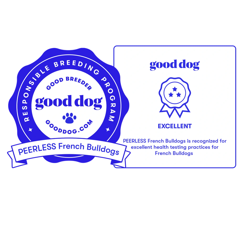 PEERLESS French Bulldogs is honored to be recognized as EXCELLENT in the Good Dog responsible breeding program for our health testing. French Bulldog breeders must test ALL breeding stock on hips, elbows, patellas, spines, and hearts in order to achieve this ranking. Very few breeders, whether they produce standard colors or not, qualify for this rank and in addition to those tests we also test thyroid, eyes, trachea and full DNA panels through Embark. We are excited to be part of a trusted community of like-minded breeders on a mission to better the breed!